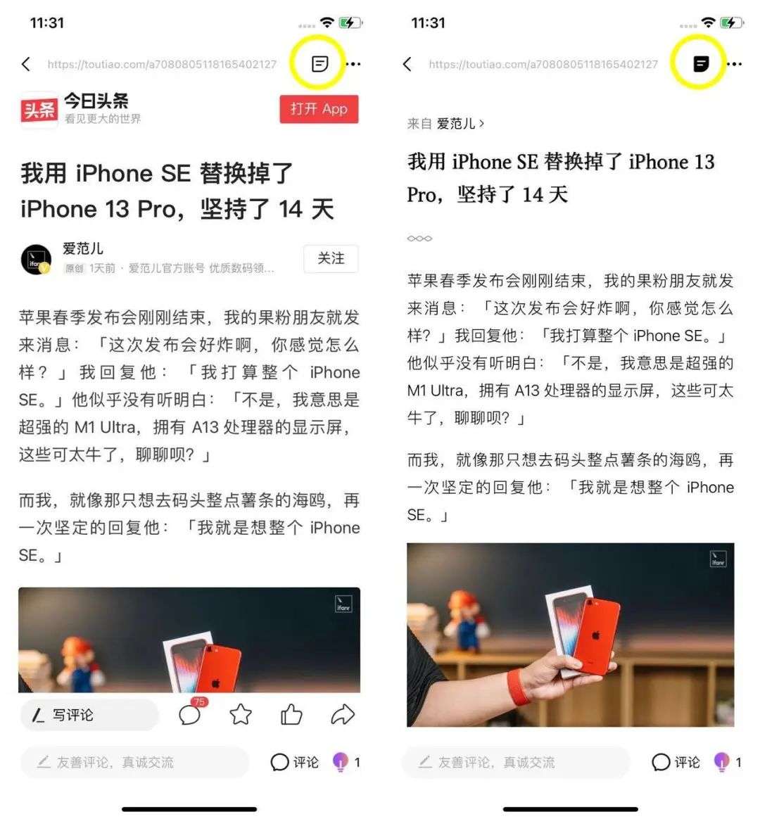 ▲默认阅读为今日头条网页,点击黄色圈圈处打开全页阅读模式,可以去掉广告等不相干的网页信息