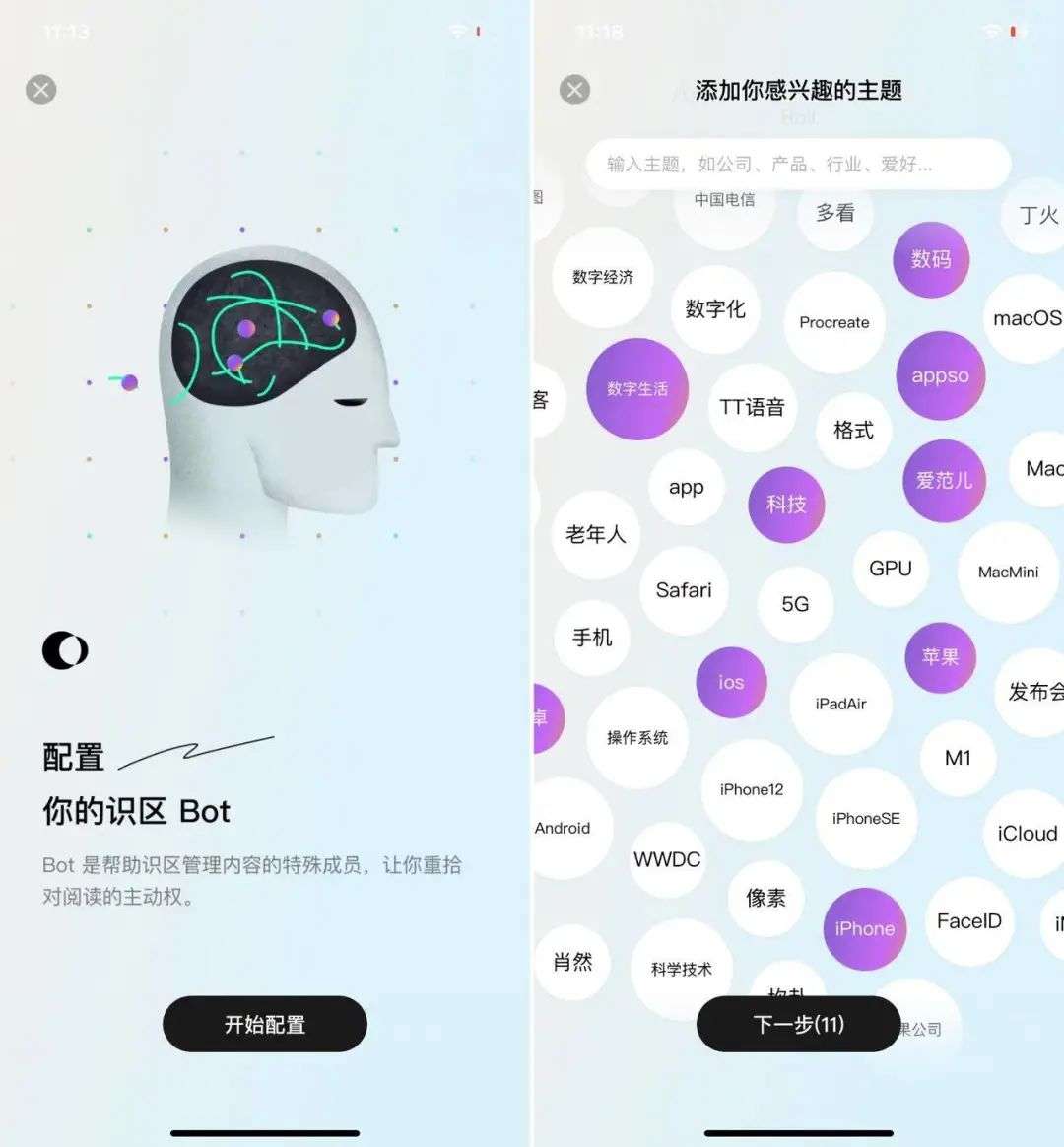 为识区 Bot 配置订阅源时,系统会先询问你感兴趣的主题,并提供发散思路——比如输入「Apple」,界面还会额外显示 3-5 个相关关键词「iPhone」「AirPods」「Apple Watch」等。这种奇妙的做法,一方面能帮助找到更精准细分的资讯内容,另一方面,也为用户提供了无限延伸和联想,能帮助打破信息茧房。