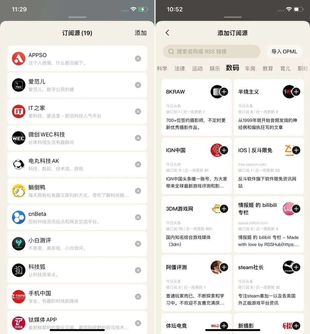 关键词选定后,算法会生成推荐一些订阅源。你也可以另外通过搜索添加或导入 RSS 链接,来调整自己的订阅列表,获取今日头条围墙以外的资讯。