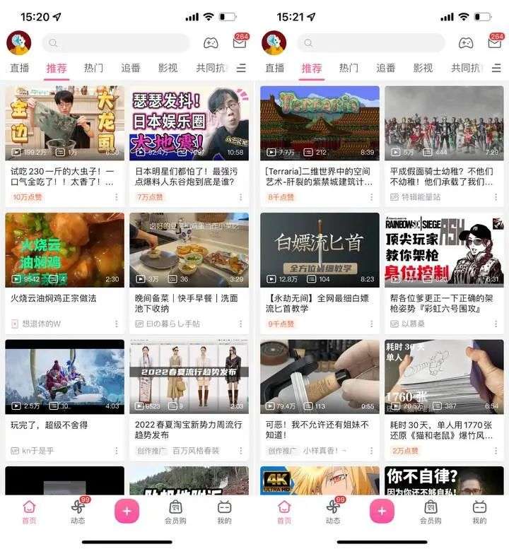 ▲左为关闭「个性化推荐」前的 B 站首页,右为关闭后